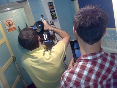 Shooting gets underway in the toilet.